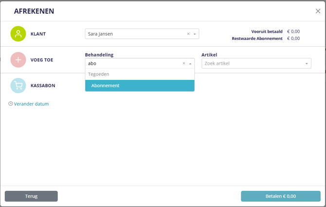 - Ga naar de Kassa (vanuit het afsprakenboek, de klantenlijst of de kassa zelf) en kies zonodig een klant.