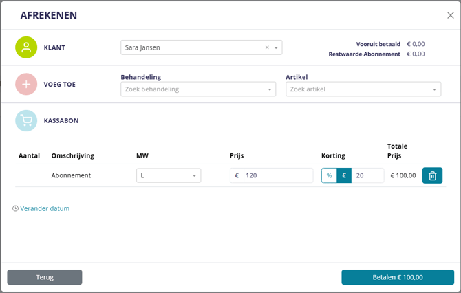 - Vul vervolgens de waarde van het Abonnement in bij de prijs en daarna de korting. Stel het abonnement kost 100 euro en de waarde is 120 euro, dan vul je het op de volgende manier in: