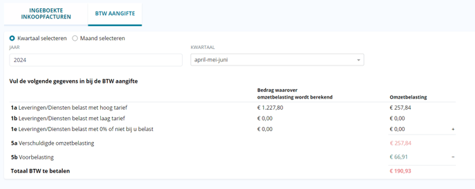 Onder het tabblad 'BTW Aangifte' kan je een kwartaal of maand selecteren waarvan je de BTW aangifte wilt zien. Om de BTW aangifte in te vullen dien je in te loggen met je account bij de belastingdienst.