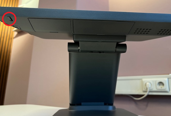 De aan/uit knop zit aan de onderkant van het scherm aan de linkerkant (in het rode rondje).