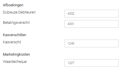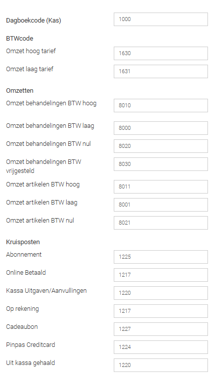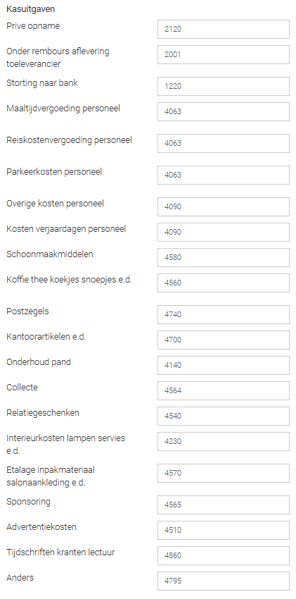 - Vul alle grootboeknummers in en klik onderaan op Opslaan. Gebruik je ons importbestand? Dan kan je in SMART de volgende nummers invullen: