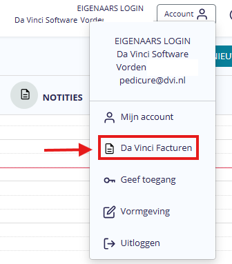 Je kan de facturen van onze software vinden door te rechtsbovenin op 'Account' te klikken.