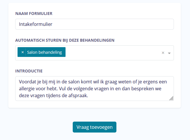 - Geef als eerste een naam aan het formulier, geef dan aan bij welke behandelingen dit formulier automatisch gestuurd moet worden en geef als laatste een korte introductie mee over het formulier.
