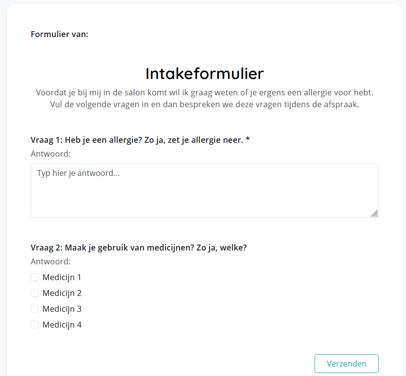 - Nu zal het formulier alleen de eerste keer dat een klant de gekozen behandeling boekt bij jou (online of in de salon), een e-mail krijgen met de vraag of de klant dit formulier in wil vullen. 24 uur voordat de afspraak plaatsvind zal er een herinnering gestuurd worden of de klant het formulier nog in wil vullen.