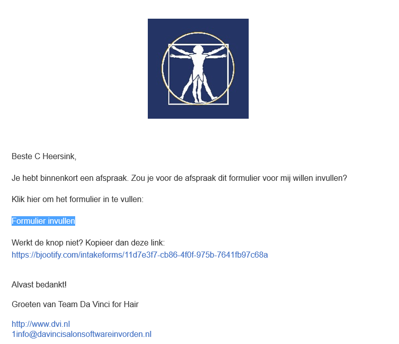 - Nu zal het formulier alleen de eerste keer dat een klant de gekozen behandeling boekt bij jou (online of in de salon), een e-mail krijgen met de vraag of de klant dit formulier in wil vullen. 24 uur voordat de afspraak plaatsvind zal er een herinnering gestuurd worden als het formulier nog niet is ingevuld of de klant het formulier nog in wil vullen.