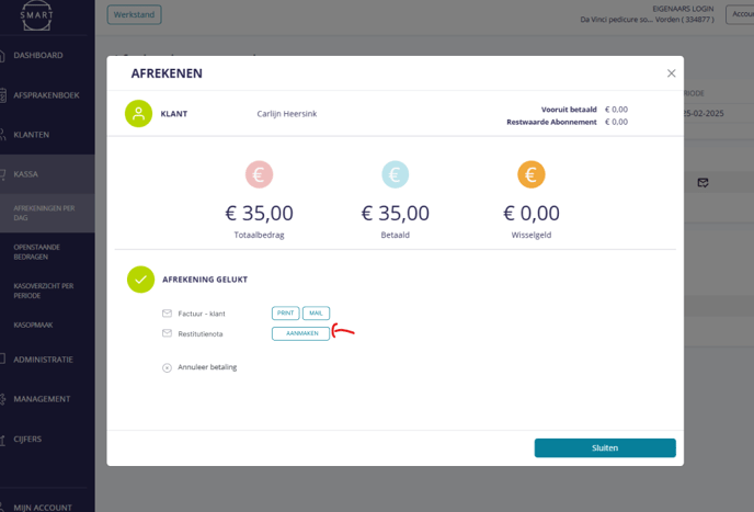 - Zodra je alle gegevens van de klant hebt kan je weer teruggaan naar deze afrekening bij Kassa > Afrekeningen per dag > kies de juiste dag en de juiste afrekening > open deze afrekening en klik dan op restituatienota
