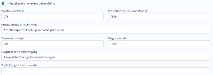 Als het gaat om Acne behandelingen in het gelaat dan is het meestal verplicht om 1 van deze diagnosecodes te gebruiken:- 1199 Aangezicht: Overige huidaandoedingen