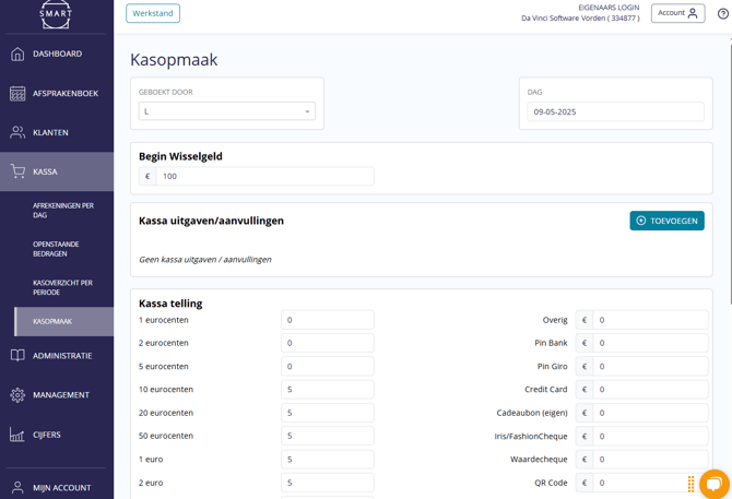 Aan het einde van de werkdag ga je naar de ‘Kassa’ > Kasopmaak