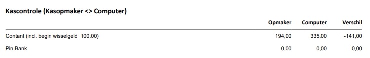 In onderstaand voorbeeld zie je dat de computer zegt dat er 335 euro in kas zou moeten zitten, terwijl jij maar 194 euro hebt geteld. Dat is dus een verschil van 141 euro.
