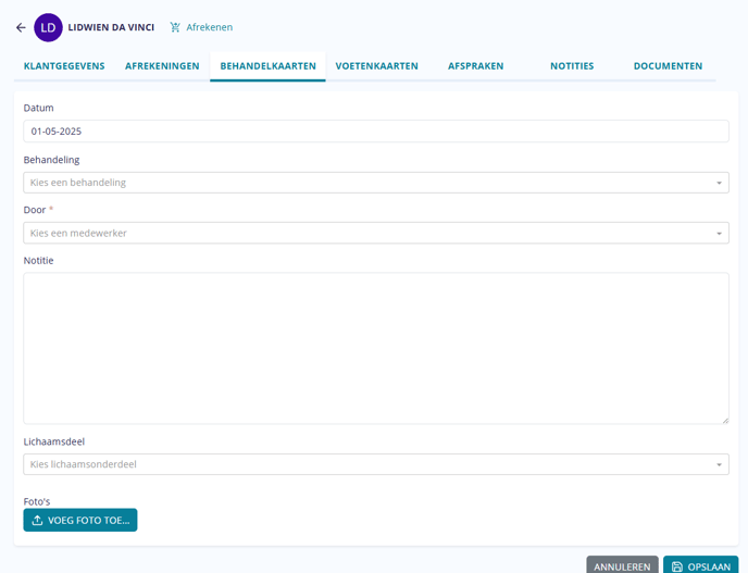 - Onderaan bij foto's kan je nog een aantal foto's toevoegen van de behandeling. Handig als je bij wil houden hoe een bepaalde behandeling verloopt of als je het resultaat wil vastleggen.