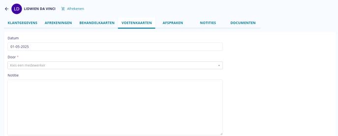 Als pedicure zal je hier vaak te vinden zijn. Hier kan je per klant bijhouden wat je hebt uitgevoerd tijdens de afspraak. Je kan zoveel voetenkaarten toevoegen als je zelf wilt. Als eerste zal je hier de lijst zien van deze ene klant van alle voetenkaarten die je ooit hebt aangemaakt.