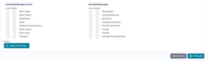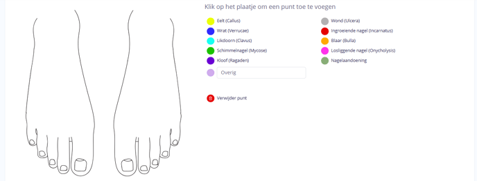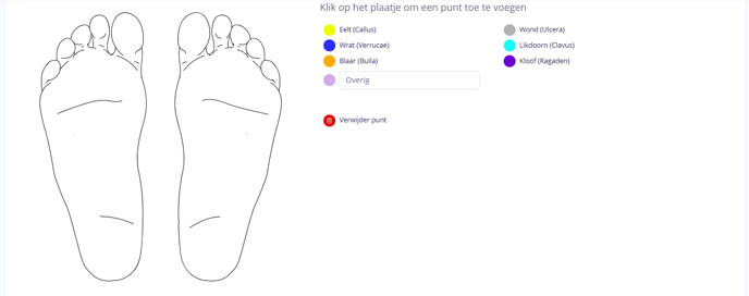- Daarna zie je de boven en onderkant van de voeten. Hier kan je met de stippen aangeven waar je wat hebt aangetroffen