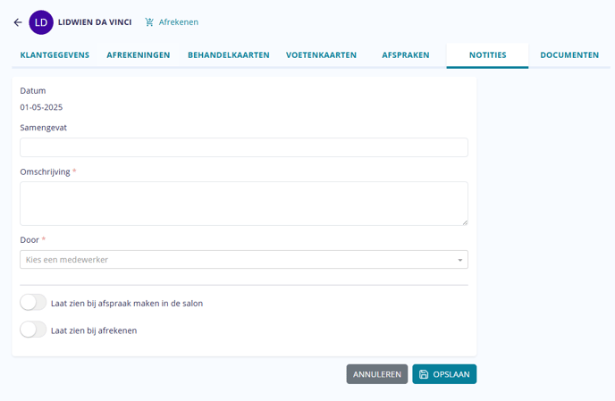 - Onderaan kan je kiezen of je deze notitie terug wil laten komen. Bijvoorbeeld bij de afspraak in het afsprakenboek of tijdens het afrekenen. Dan zal dit altijd naar voren komen op dat moment. Vindt je dit later vervelend worden of hoeft een bepaalde notitie niet meer naar voren te komen? Dan kan je deze vinkjes altijd uitzetten.