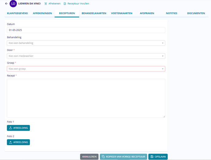 - Tip: Mocht je dezelfde receptuur als de vorige keer hebben gebruikt, dan kan je altijd de receptuur kopiëren zodat je ook van de behandeling van vandaag alle gegevens hebt en weet wat gedaan is.