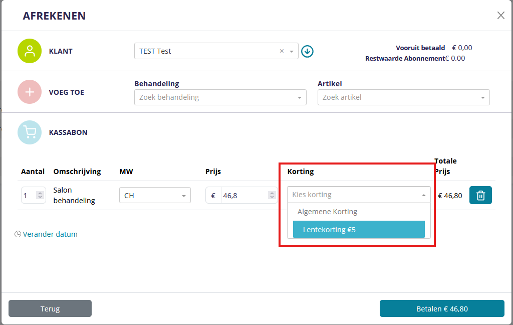 - Kies de behandeling die je wilt afrekenen (of hij is al automatisch toegevoegd als je vanuit het afsprakenboek komt). Aan het einde van een behandeling of artikel regel zie je nu een dropdown bij 'Korting' staan. Kies hier een kortingskaart.