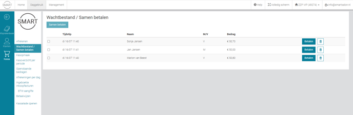 Het wachtbestand is een lijst in ons programma waar je klanten alvast klaar kan zetten zodat het afrekenen daarna makkelijker wordt en sneller gaat. Je zet bijvoorbeeld alvast de kleuring met producten etc klaar, de hele afrekening zet je dus al klaar. Dan als het tijd is voor de klant om te betalen hoef je alleen nog maar op betalen te klikken. Ook belangrijk is dat je vanuit het wachtbestand 2 klanten samen kan laten betalen. Dus moeder en dochter samen, man en vrouw samen etc.