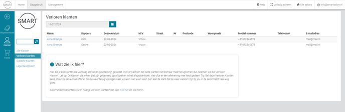 Een verloren klant noemen we zo als een klant 20 weken of langer niet geweest is. Dan gaan we er vanuit dat deze klant niet meer bij je terugkomt. Handig om te weten wie dit zijn zodat je er iets aan kan doen. In deze lijst kan je precies zien per dag wie er 20 weken niet zijn geweest. Vervolgens kan jij de telefoon oppakken om te bellen en te vragen of ze nog een afspraak bij je willen maken. Misschien krijg je ook wel hele fijne feedback te horen waarom ze niet meer terugkomen. Tip: Als je het marketingpakket erbij neemt kan je automatische berichten sturen naar 'verloren klanten' zodat je verloren klanten weer terugkomen.