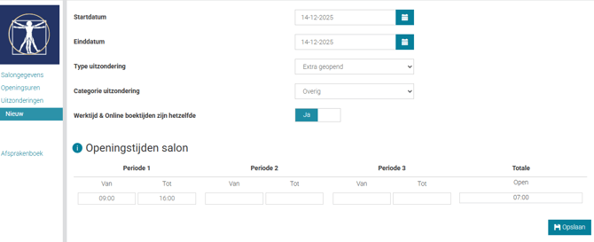 Zet bij 'openingstijden salon' de openingstijden neer.