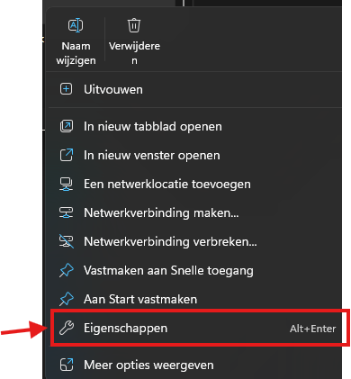 Zoek 'Deze pc' en klik met je rechtermuisknop zodat je het menu ziet. Kies dan voor 'Eigenschappen'.
