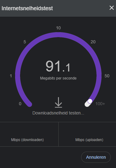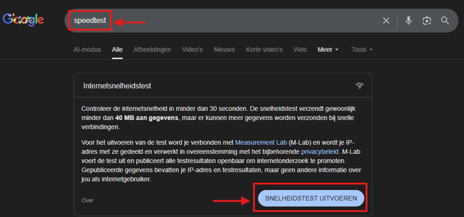 Klik op de knop 'Snelheidstest uitvoeren' en de test gaat meteen van start.