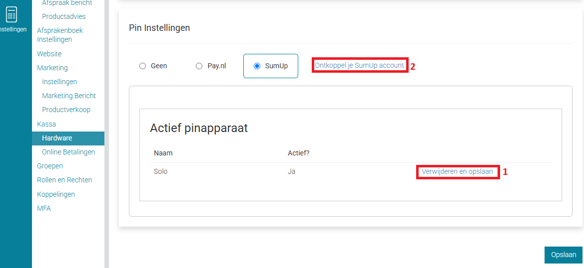 - Klik bij Pin Instellingen eerst op 'Verwijderen en Opslaan' en daarna voor 'Ontkoppel je SumUp Account'.