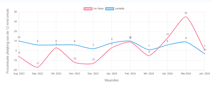 Buiten dat om kan je ook vergelijken met heel Nederland. Dus ... stel, jij heb net iets minder omzet gehaald in juli 2024 dan een jaar eerder in juli 2023. Maar je ziet ook dat alle andere salons in Nederland het ook net iets minder hebben gedaan. Het kan dus zijn dat het niet aan jou heeft gelegen dit jaar, maar net aan de situatie in het land. Het weer was bijvoorbeeld minder goed, er gaan meer mensen op vakantie of wat dan ook.