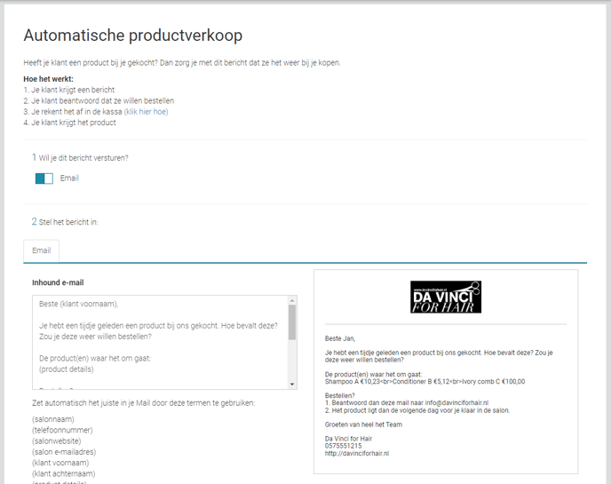 Stel je voor ... mevrouw Jansen heeft een product bij je gekocht. Hartstikke leuk! Maar hoe zorg je er voor dat ze dit product weer kopen? Dat kan met deze automatische productverkoop mail. 8 weken na de aankoop van het product krijgt je klant automatisch een mail met de vraag of ze het product weer willen kopen. Hoef jij die vraag niet meer te stellen, maar doe het systeem het voor je. :) En gaat je productverkoop toch omhoog.