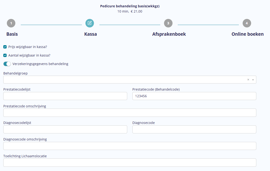 Ga hiervoor naar Management > Prijslijst > Behandelingen > Kies een behandeling. Ga dan naar stap 2: Kassa en klap het veld open 'verzekeringsgegevens nodig'. Vul de codes in die nodig zijn.