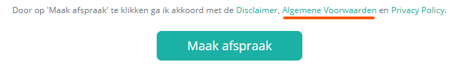 - Als er nu een online afspraak wordt geboekt via je mini website zal er boven de knop 'Maak afspraak' ook de algemene voorwaarden link tevoorschijn komen.