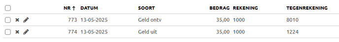 - 1 regel dat er geld uit gaat > € 35 komt op de kruispost 1217 te staan (in ons voorbeeld is 1217 de kruispost op rekening). Deze kruispost komt dan dus op min € 35 te staan.
