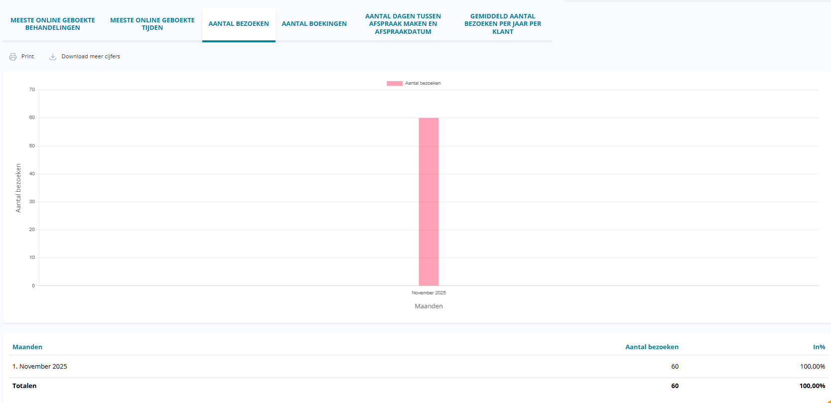Op deze pagina kan je zien hoeveel bezoeken je in je salon hebt gehad in een bepaalde periode per maand.