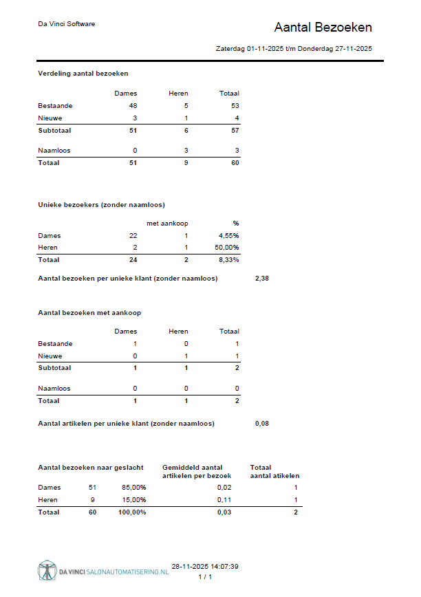 Wil je nog meer informatie over het aantal bezoeken in je salon? Klik dan op de knop 'Download meer cijfers'. Dan zal een PDF gedownload worden waarop je kan zien hoeveel bestaande en nieuwe klanten geweest zijn, wat het totaal aantal mannen en vrouwen is geweest, etc.