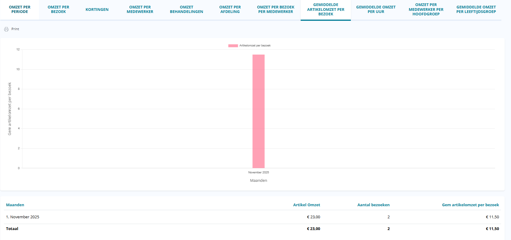 Je ziet de totale artikelomzet van een maand met daarnaast het totaal aantal bezoeken in je salon in de periode die je zelf hebt gekozen.