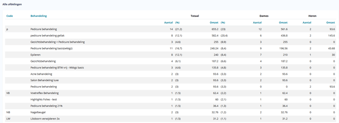 Kies zelf de periode waarvan je de omzet per behandeling wilt zien en scroll dan naar beneden. Dan zie je per behandeling het totaal aantal keer dat deze behandeling is afgerekend en wat de totale omzet is van deze behandeling in je zelfgekozen periode.