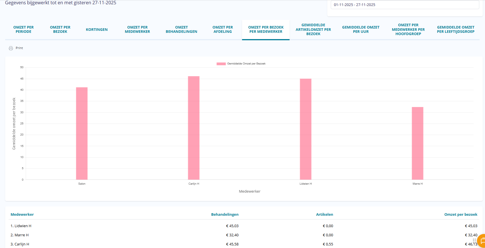 Hier kan je zien welke medewerker de hoogste omzet per bezoek heeft.